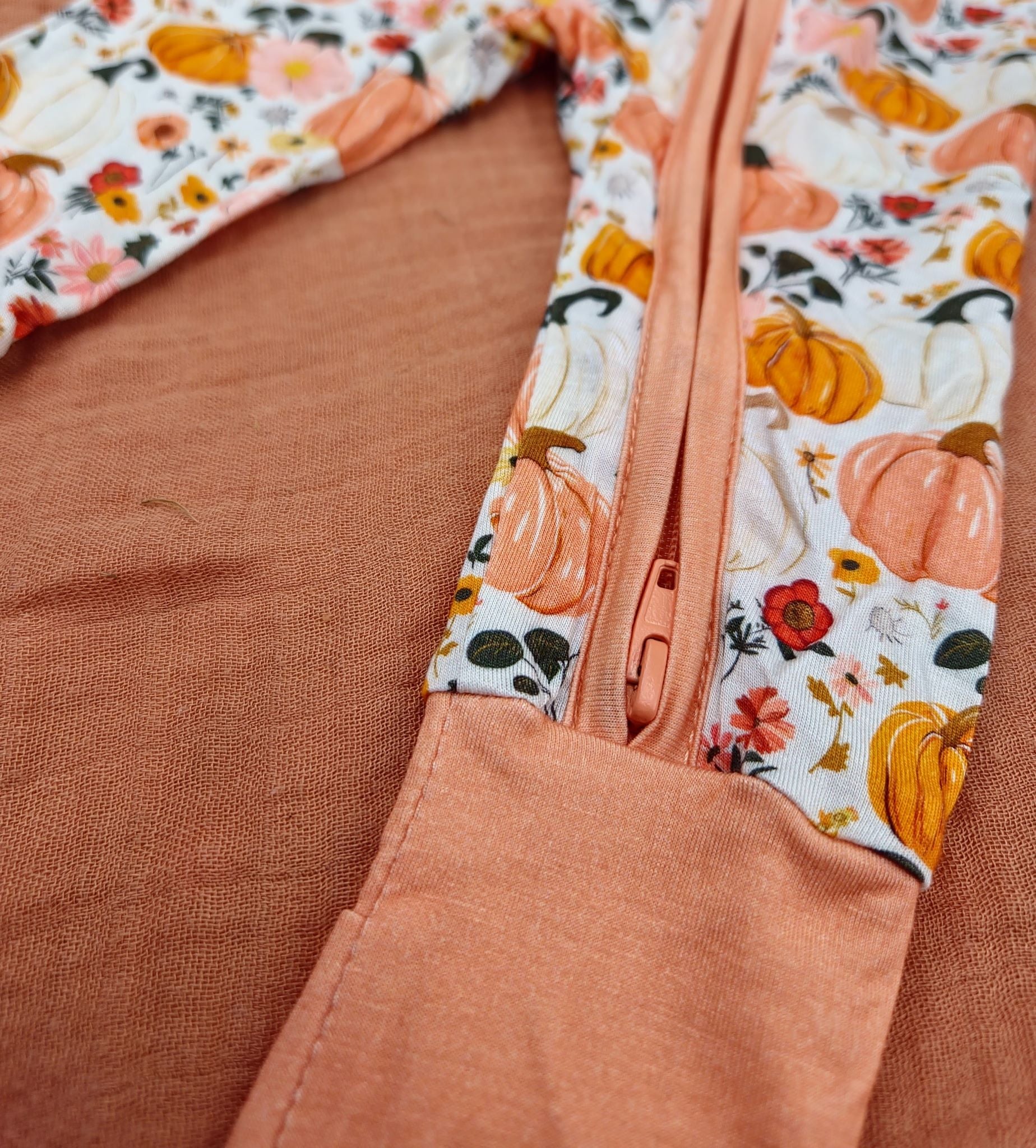 Sweet dreams are made of pumpkins! The Dreamy Pumpkin Bamboo Sleeper is crafted from soft bamboo fabric that’s breathable, stretchy, and gentle on sensitive skin. With a festive pumpkin print, it’s the perfect mix of cozy comfort and seasonal charm. A double zipper makes late-night changes a breeze, while fold-over foot cuffs keep little toes snug.