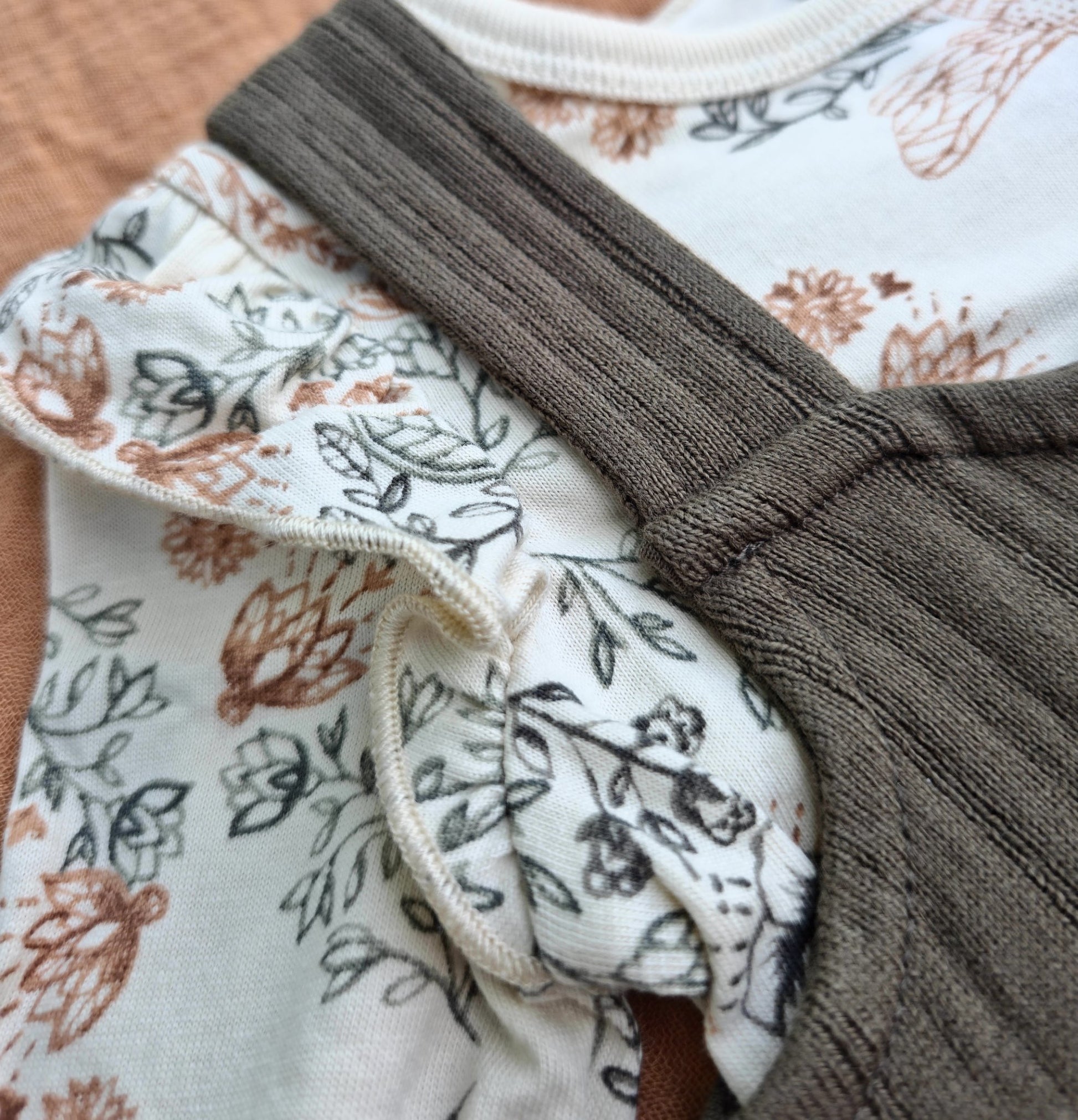 Sweet, timeless, and full of charm — this set is perfect for your little bee. Featuring a soft ribbed jumper layered over a ruffle-sleeve tee, it’s designed with comfort and style in mind. Functional buttons make dressing easy, while the included diaper cover (sizes 0–24M) keeps little ones covered while they play and explore. A darling outfit for everyday wear or special occasions.