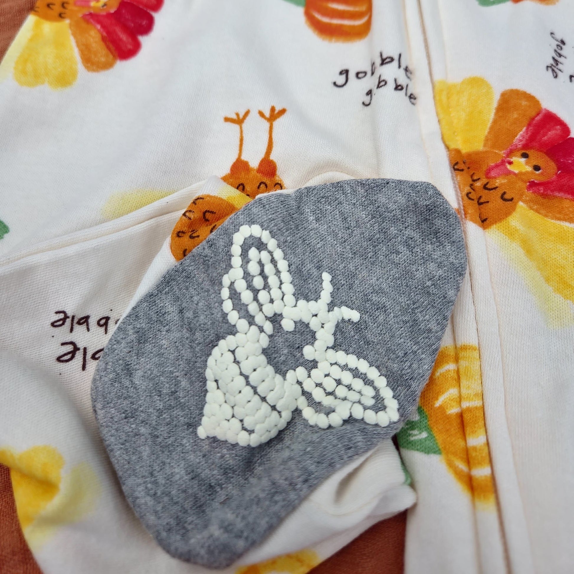Get your little one ready for Thanksgiving snuggles with the Turkey Gobble Sleeper! Made from 100% organic cotton, this footed sleeper is soft, breathable, and gentle on sensitive skin. With its festive turkey-themed design, it’s perfect for celebrating the season in cozy style. The zip front makes changes quick and easy, while the snug, stretchy fit keeps your baby comfy from playtime to bedtime. The cutest way to gobble up all those holiday memories!