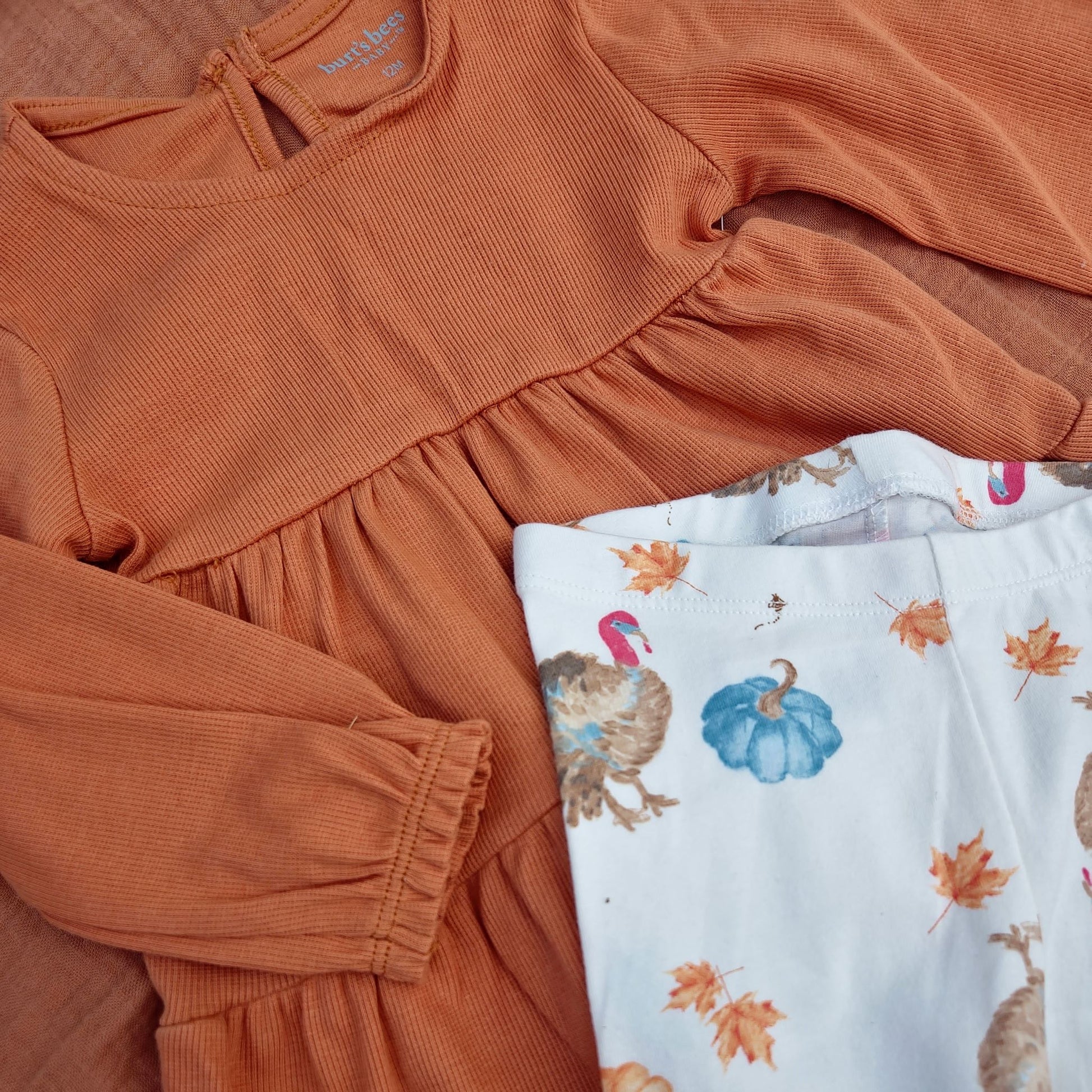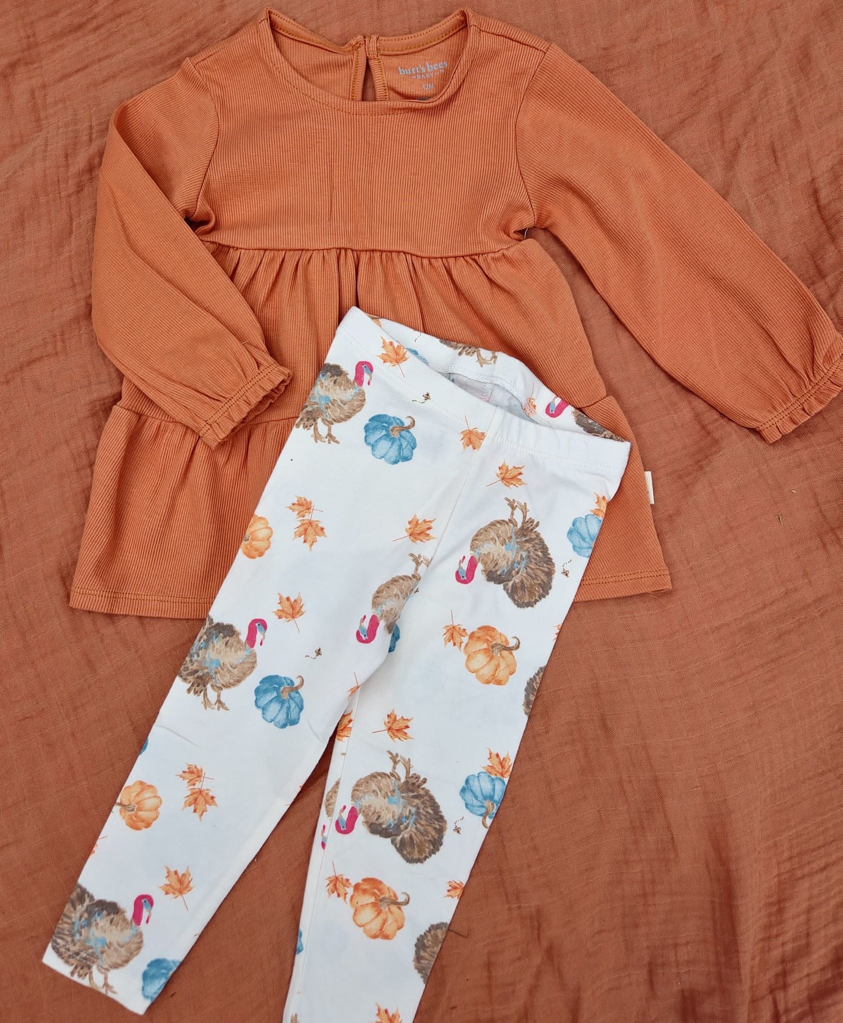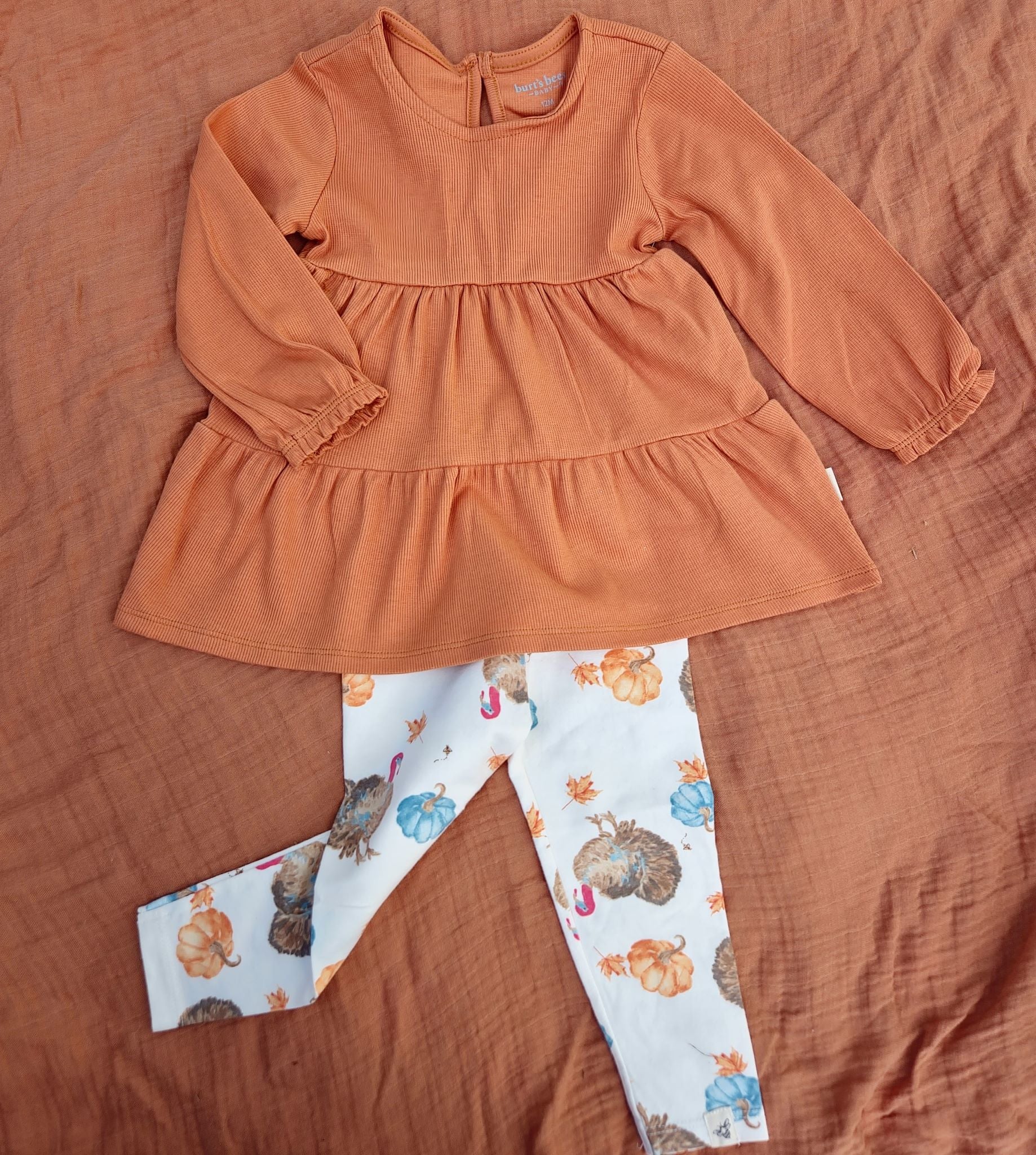 Celebrate Thanksgiving in style with this Turkey Time Set! This adorable outfit features a festive orange tunic top paired with coordinating turkey-print leggings for a look that’s as sweet as pumpkin pie. Made from 100% organic cotton, it’s soft, breathable, and gentle on sensitive skin—perfect for holiday gatherings, family photos, or cozy fall days.